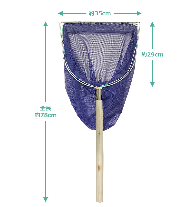 全長は約78cm。柄の長さは約49cmで、たも網の横幅は約35cm、縦は約29cmです。