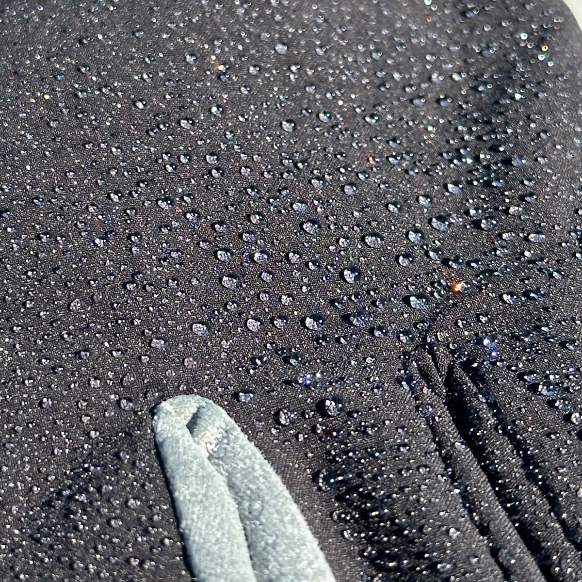 手袋甲の素材には、防水加工が施されたCORDURAを使用しています。手袋についた水滴を拭き取っても、どこが濡れていたかわからないほどの撥水性を持っています。