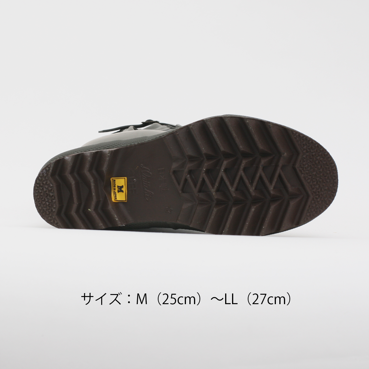 つま先から足首にかけてゴム生地を何枚も重ね貼りし、足首部分をスリムに設計。足首に安定感がありアウトドアでの長時間の歩行に最適です。靴底は、専用の特別な配合のゴムを使用し、滑りやすい斜面でもグリップが効いて安心です。野暮ったく見えない細身のシルエットは、私服に合わせてタウンユースにも