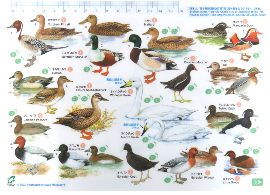 オシドリ(♂♀) コガモ(♂♀) オカヨシガモ(♂♀) マガモ(♂♀) カルガモ ハシビロガモ(♂♀) ヒドリガモ(♂♀) スズガモ(♂♀) オナガガモ(♂♀) キンクロハジロ(♂♀) ホシハジロ(♂♀) カイツブリ バン オオバン オオハクチョウ コハクチョウ