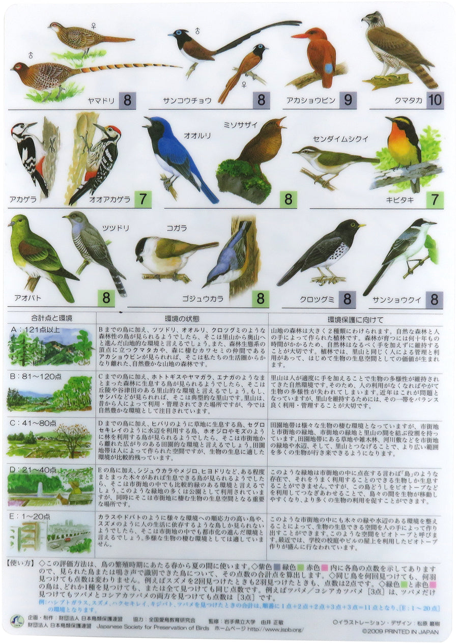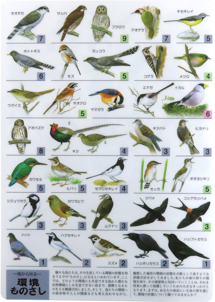 環境の状態を知るうえで『ものさし』と言われる鳥たち。その鳥たちから指標となるもの50種を選びました。環境の状態を5つの区分で表し、それぞれの環境の状態と保護目標について解説しています。各野鳥に表示された点数を加算した合計点で、その場所の状態を知ることができます。※【鳥から知る 環境ものさし】のシートは音がでません。