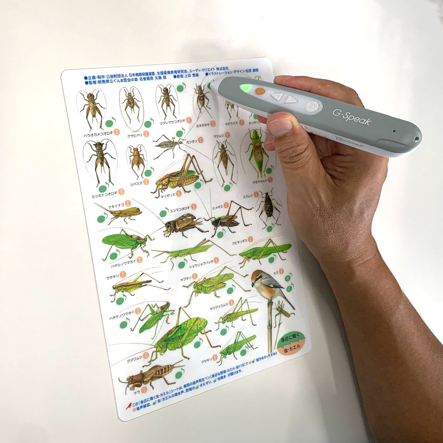 「身近な野鳥」「水辺の野鳥」「身近に鳴く虫・カエル」のB5判サイズの野鳥や虫・カエルの下敷きは、G-Speakを使えば、鳴き声と解説を聞くことができます!