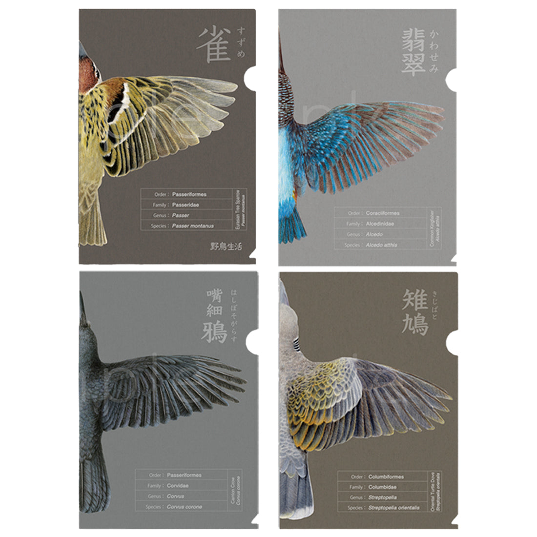羽衣名称クリアファイル 全4種 スズメ・カワセミ・ハシボソガラス・キジバト【野鳥生活】