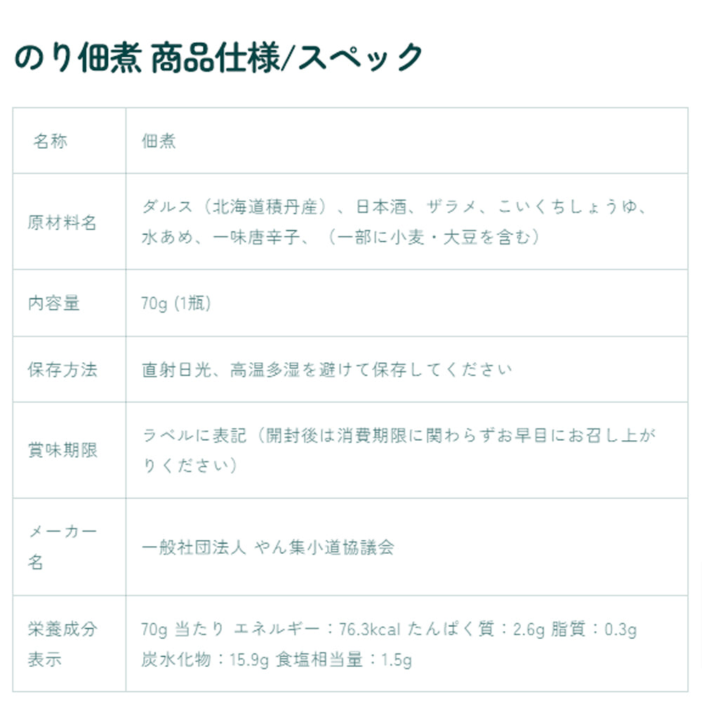 | 原材料名 | ダルス(北海道積丹産)、日本酒、ザラメ、こいくちしょうゆ、水あめ、一味唐辛子、(一部に小麦・大豆を含む) |